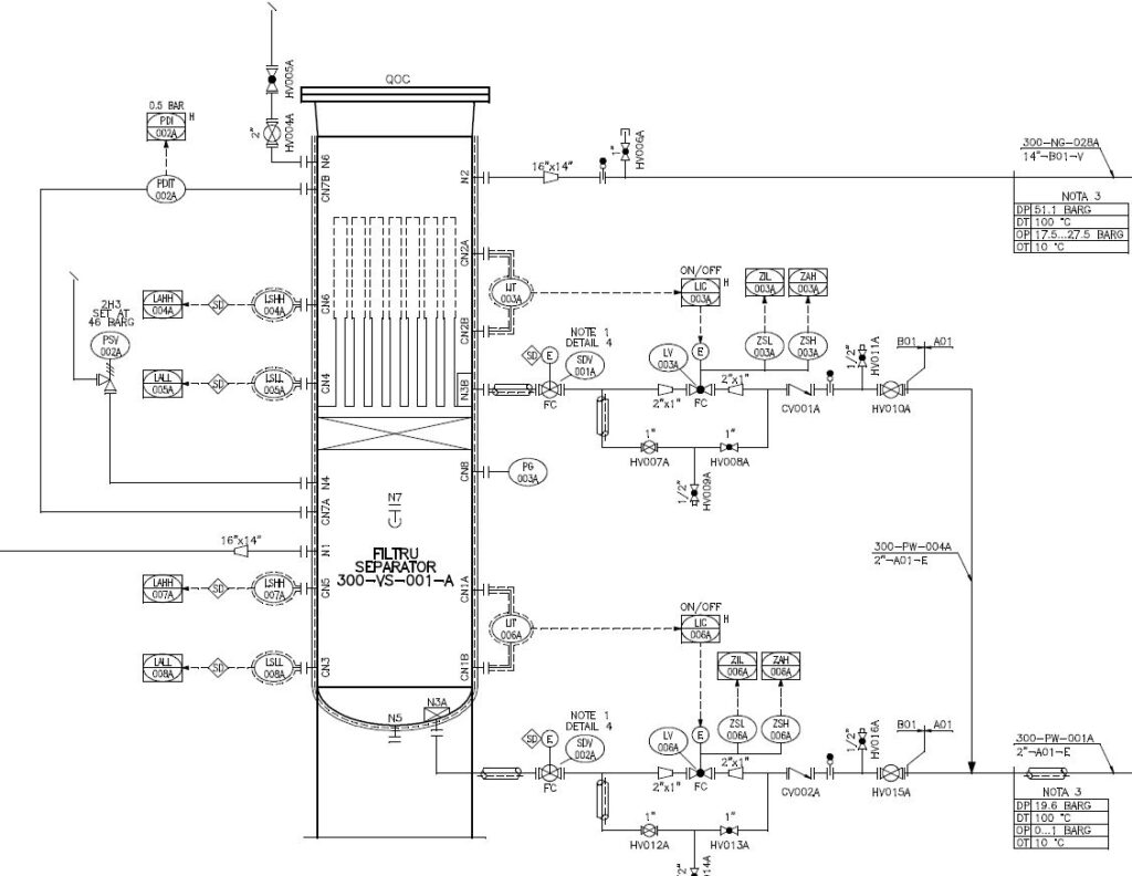 Technological process of the plant – fully defined starting from concept documents, philosophies, design memories, process descriptions, process simulations and calculations for equipment and piping sizing, P&ID schemes, flow diagrams, cause and effect diagrams, etc.